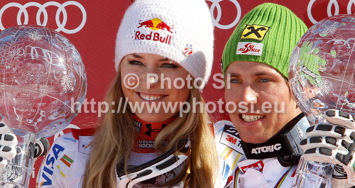 : Overall Men FIS alpine skiing World cup winner Marcel Hirscher of Austria (R) and overall Women FIS alpine skiing World cup winner Lindsey Vonn of USA celebrate their trophies after last race of Audi FIS Alpine skiing World cup finals in Schladming, Austria. Last race of Audi FIS Alpine skiing World cup finals was held in Schladming, Austria, on Sunday, 18th of March 2012.