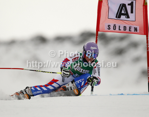 : Tessa Worley of France skiing in first run of women giant slalom race of Audi FIS Alpine skiing World cup 2012-2013 in Soelden, Austria. First women giant slalom race of Audi FIS Alpine skiing World cup was held on Rettenbach glacier above Soelden, Austria, on Saturday, 27th of October 2012.