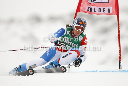 : Dominique Gisin of Switzerland skiing in first run of women giant slalom race of Audi FIS Alpine skiing World cup 2012-2013 in Soelden, Austria. First women giant slalom race of Audi FIS Alpine skiing World cup was held on Rettenbach glacier above Soelden, Austria, on Saturday, 27th of October 2012.