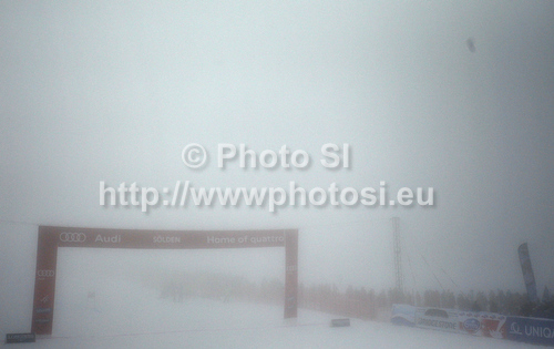 : Fog on course during second run of women giant slalom race of Audi FIS Alpine skiing World cup 2012-2013 in Soelden, Austria. First women giant slalom race of Audi FIS Alpine skiing World cup was held on Rettenbach glacier above Soelden, Austria, on Saturday, 27th of October 2012.