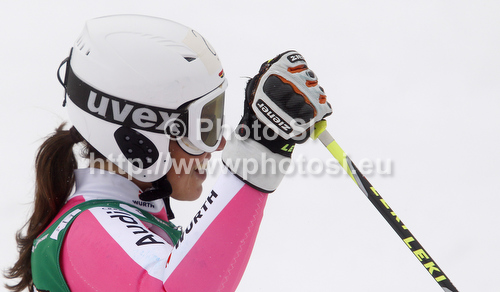 : Susanne Weinbuchner of Germany reacts in finish of second run of women giant slalom race of Audi FIS Alpine skiing World cup 2012-2013 in Soelden, Austria. First women giant slalom race of Audi FIS Alpine skiing World cup was held on Rettenbach glacier above Soelden, Austria, on Saturday, 27th of October 2012.
