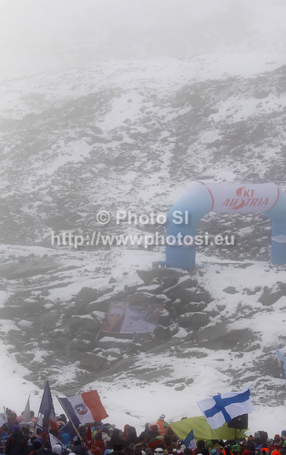 : Spectators in foggy finish area during second run of women giant slalom race of Audi FIS Alpine skiing World cup 2012-2013 in Soelden, Austria. First women giant slalom race of Audi FIS Alpine skiing World cup was held on Rettenbach glacier above Soelden, Austria, on Saturday, 27th of October 2012.