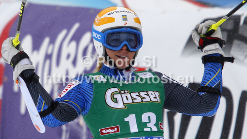 : Jessica Lindell-Vikarby of Sweden reacts in finish of second run of women giant slalom race of Audi FIS Alpine skiing World cup 2012-2013 in Soelden, Austria. First women giant slalom race of Audi FIS Alpine skiing World cup was held on Rettenbach glacier above Soelden, Austria, on Saturday, 27th of October 2012.