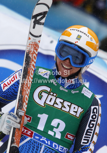 : Jessica Lindell-Vikarby of Sweden reacts in finish of second run of women giant slalom race of Audi FIS Alpine skiing World cup 2012-2013 in Soelden, Austria. First women giant slalom race of Audi FIS Alpine skiing World cup was held on Rettenbach glacier above Soelden, Austria, on Saturday, 27th of October 2012.