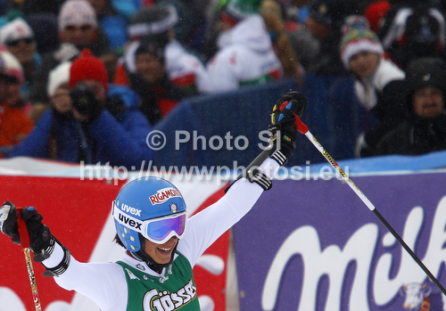: Irene Curtoni of Italy reacts in finish of second run of women giant slalom race of Audi FIS Alpine skiing World cup 2012-2013 in Soelden, Austria. First women giant slalom race of Audi FIS Alpine skiing World cup was held on Rettenbach glacier above Soelden, Austria, on Saturday, 27th of October 2012.