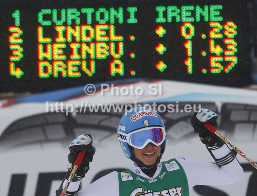: Irene Curtoni of Italy reacts in finish of second run of women giant slalom race of Audi FIS Alpine skiing World cup 2012-2013 in Soelden, Austria. First women giant slalom race of Audi FIS Alpine skiing World cup was held on Rettenbach glacier above Soelden, Austria, on Saturday, 27th of October 2012.