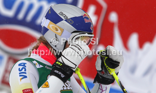 : Lindsey Vonn of USA disappointed after DNF in finish of second run of women giant slalom race of Audi FIS Alpine skiing World cup 2012-2013 in Soelden, Austria. First women giant slalom race of Audi FIS Alpine skiing World cup was held on Rettenbach glacier above Soelden, Austria, on Saturday, 27th of October 2012.