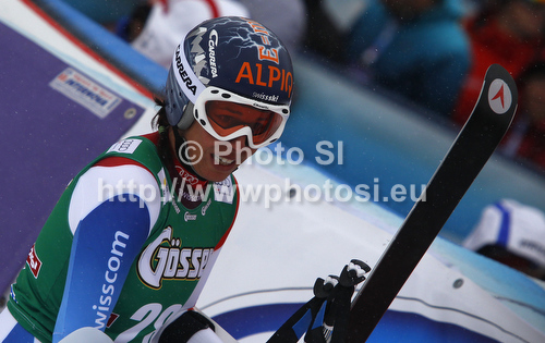 : Fourth placed Dominique Gisin of Switzerland reacts in finish of second run of women giant slalom race of Audi FIS Alpine skiing World cup 2012-2013 in Soelden, Austria. First women giant slalom race of Audi FIS Alpine skiing World cup was held on Rettenbach glacier above Soelden, Austria, on Saturday, 27th of October 2012.