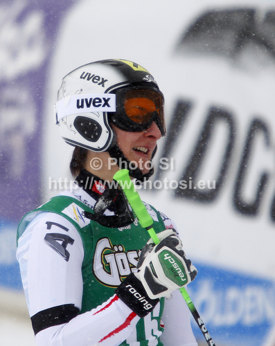 : Second placed Kathrin Zettel of Austria reacts in finish of second run of women giant slalom race of Audi FIS Alpine skiing World cup 2012-2013 in Soelden, Austria. First women giant slalom race of Audi FIS Alpine skiing World cup was held on Rettenbach glacier above Soelden, Austria, on Saturday, 27th of October 2012.