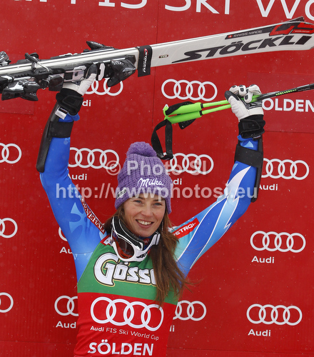 : Winner Tina Maze of Slovenia celebrates her medal won in women giant slalom race of Audi FIS Alpine skiing World cup 2012-2013 in Soelden, Austria. First women giant slalom race of Audi FIS Alpine skiing World cup was held on Rettenbach glacier above Soelden, Austria, on Saturday, 27th of October 2012.