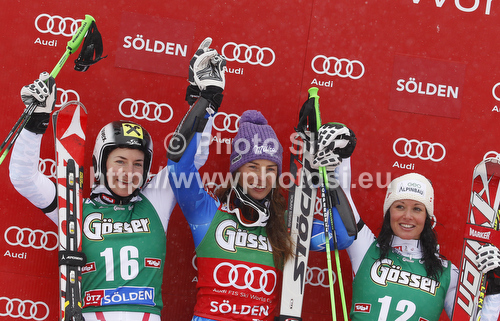 : Winner Tina Maze of Slovenia (M), second placed Kathrin Zettel of Austria (L) and third placed Stefanie Koehle of Austria (R) celebrate their medals won in women giant slalom race of Audi FIS Alpine skiing World cup 2012-2013 in Soelden, Austria. First women giant slalom race of Audi FIS Alpine skiing World cup was held on Rettenbach glacier above Soelden, Austria, on Saturday, 27th of October 2012.