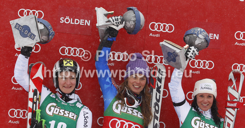 : Winner Tina Maze of Slovenia (M), second placed Kathrin Zettel of Austria (L) and third placed Stefanie Koehle of Austria (R) celebrate their medals won in women giant slalom race of Audi FIS Alpine skiing World cup 2012-2013 in Soelden, Austria. First women giant slalom race of Audi FIS Alpine skiing World cup was held on Rettenbach glacier above Soelden, Austria, on Saturday, 27th of October 2012.