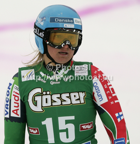 : Tanja Poutiainen of Finland rects in finish of first run of women giant slalom race of Audi FIS Alpine skiing World cup 2012-2013 in Soelden, Austria. First women giant slalom race of Audi FIS Alpine skiing World cup was held on Rettenbach glacier above Soelden, Austria, on Saturday, 27th of October 2012.