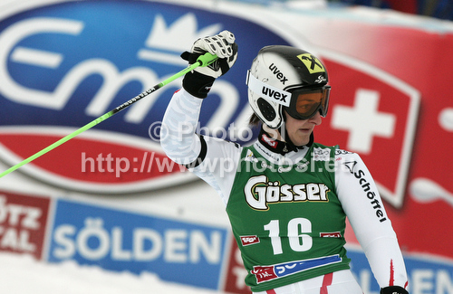: Kathrin Zettel of Austria rects in finish of first run of women giant slalom race of Audi FIS Alpine skiing World cup 2012-2013 in Soelden, Austria. First women giant slalom race of Audi FIS Alpine skiing World cup was held on Rettenbach glacier above Soelden, Austria, on Saturday, 27th of October 2012.