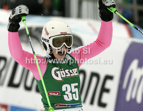 : Simona Hoesl of Germany rects in finish of first run of women giant slalom race of Audi FIS Alpine skiing World cup 2012-2013 in Soelden, Austria. First women giant slalom race of Audi FIS Alpine skiing World cup was held on Rettenbach glacier above Soelden, Austria, on Saturday, 27th of October 2012.