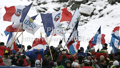 : French spectators in finish of first run of women giant slalom race of Audi FIS Alpine skiing World cup 2012-2013 in Soelden, Austria. First women giant slalom race of Audi FIS Alpine skiing World cup was held on Rettenbach glacier above Soelden, Austria, on Saturday, 27th of October 2012.