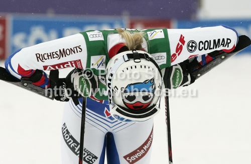 : Adeline Baud of France reacts in finish of first run of women giant slalom race of Audi FIS Alpine skiing World cup 2012-2013 in Soelden, Austria. First women giant slalom race of Audi FIS Alpine skiing World cup was held on Rettenbach glacier above Soelden, Austria, on Saturday, 27th of October 2012.