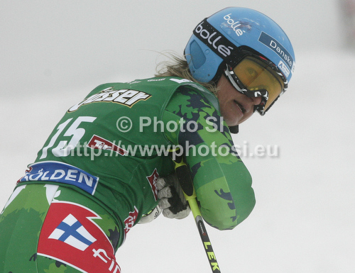 : Tanja Poutiainen of Finland reacts in finish of second run of women giant slalom race of Audi FIS Alpine skiing World cup 2012-2013 in Soelden, Austria. First women giant slalom race of Audi FIS Alpine skiing World cup was held on Rettenbach glacier above Soelden, Austria, on Saturday, 27th of October 2012.