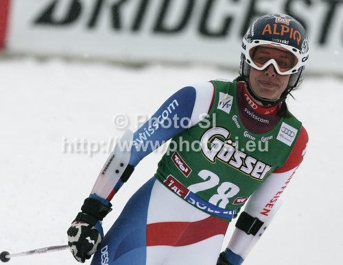 : Dominique Gisin of Switzerland reacts in finish of second run of women giant slalom race of Audi FIS Alpine skiing World cup 2012-2013 in Soelden, Austria. First women giant slalom race of Audi FIS Alpine skiing World cup was held on Rettenbach glacier above Soelden, Austria, on Saturday, 27th of October 2012.