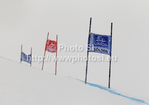 : Race course of the first run of men giant slalom race of Audi FIS Alpine skiing World cup 2012-2013 in Soelden, Austria in snow storm. First men giant slalom race of Audi FIS Alpine skiing World cup was held on Rettenbach glacier above Soelden, Austria, on Sunday, 28th of October 2012.