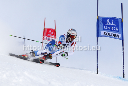 : Thomas Tumler of Switzerland skiing in first run of men giant slalom race of Audi FIS Alpine skiing World cup 2012-2013 in Soelden, Austria. First men giant slalom race of Audi FIS Alpine skiing World cup was held on Rettenbach glacier above Soelden, Austria, on Sunday, 28th of October 2012.