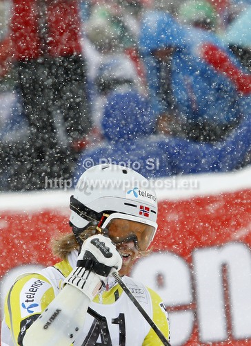 : Leif Kristian Haugen of Norway reacts in finish of second run of men giant slalom race of Audi FIS Alpine skiing World cup 2012-2013 in Soelden, Austria. First men giant slalom race of Audi FIS Alpine skiing World cup was held on Rettenbach glacier above Soelden, Austria, on Sunday, 28th of October 2012.