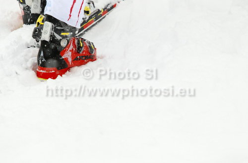 : Ski boots of Benjamin Raich of Austria after finishing second run of men giant slalom race of Audi FIS Alpine skiing World cup 2012-2013 in Soelden, Austria. First men giant slalom race of Audi FIS Alpine skiing World cup was held on Rettenbach glacier above Soelden, Austria, on Sunday, 28th of October 2012.