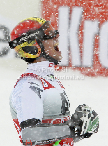 : Third placed Marcel Hirscher of Austria reacts in finish of second run of men giant slalom race of Audi FIS Alpine skiing World cup 2012-2013 in Soelden, Austria. First men giant slalom race of Audi FIS Alpine skiing World cup was held on Rettenbach glacier above Soelden, Austria, on Sunday, 28th of October 2012.