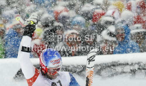 : Didier Defago of Switzerland reacts in finish of second run of men giant slalom race of Audi FIS Alpine skiing World cup 2012-2013 in Soelden, Austria. First men giant slalom race of Audi FIS Alpine skiing World cup was held on Rettenbach glacier above Soelden, Austria, on Sunday, 28th of October 2012.