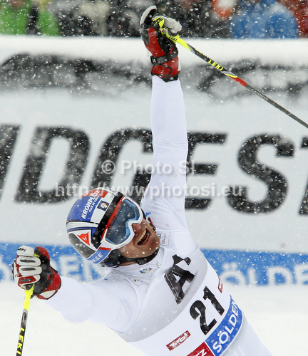 : Second placed Manfred Moelgg of Italy reacts in finish of second run of men giant slalom race of Audi FIS Alpine skiing World cup 2012-2013 in Soelden, Austria. First men giant slalom race of Audi FIS Alpine skiing World cup was held on Rettenbach glacier above Soelden, Austria, on Sunday, 28th of October 2012.