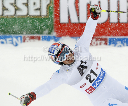 : Second placed Manfred Moelgg of Italy reacts in finish of second run of men giant slalom race of Audi FIS Alpine skiing World cup 2012-2013 in Soelden, Austria. First men giant slalom race of Audi FIS Alpine skiing World cup was held on Rettenbach glacier above Soelden, Austria, on Sunday, 28th of October 2012.