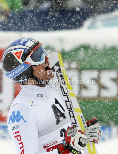 : Second placed Manfred Moelgg of Italy reacts in finish of second run of men giant slalom race of Audi FIS Alpine skiing World cup 2012-2013 in Soelden, Austria. First men giant slalom race of Audi FIS Alpine skiing World cup was held on Rettenbach glacier above Soelden, Austria, on Sunday, 28th of October 2012.