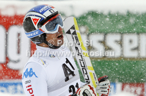 : Second placed Manfred Moelgg of Italy reacts in finish of second run of men giant slalom race of Audi FIS Alpine skiing World cup 2012-2013 in Soelden, Austria. First men giant slalom race of Audi FIS Alpine skiing World cup was held on Rettenbach glacier above Soelden, Austria, on Sunday, 28th of October 2012.