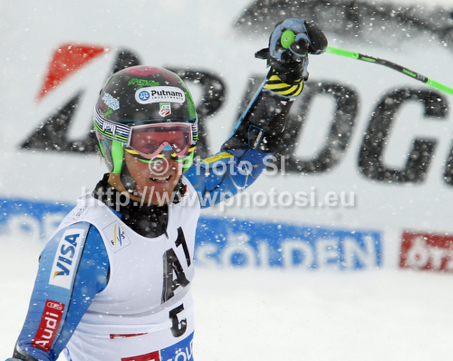 : Winner Ted Ligety of USA reacts in finish of second run of men giant slalom race of Audi FIS Alpine skiing World cup 2012-2013 in Soelden, Austria. First men giant slalom race of Audi FIS Alpine skiing World cup was held on Rettenbach glacier above Soelden, Austria, on Sunday, 28th of October 2012.