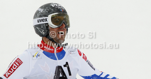 : Fourth placed Thomas Fanara of France reacts in finish of second run of men giant slalom race of Audi FIS Alpine skiing World cup 2012-2013 in Soelden, Austria. First men giant slalom race of Audi FIS Alpine skiing World cup was held on Rettenbach glacier above Soelden, Austria, on Sunday, 28th of October 2012.