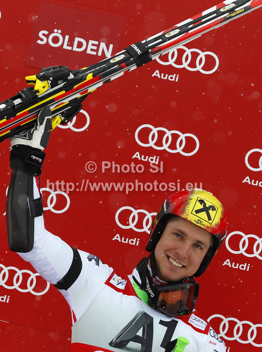 : Third placed Marcel Hirscher of Austria celebrates his medal won in men giant slalom race of Audi FIS Alpine skiing World cup 2012-2013 in Soelden, Austria. First men giant slalom race of Audi FIS Alpine skiing World cup was held on Rettenbach glacier above Soelden, Austria, on Sunday, 28th of October 2012.