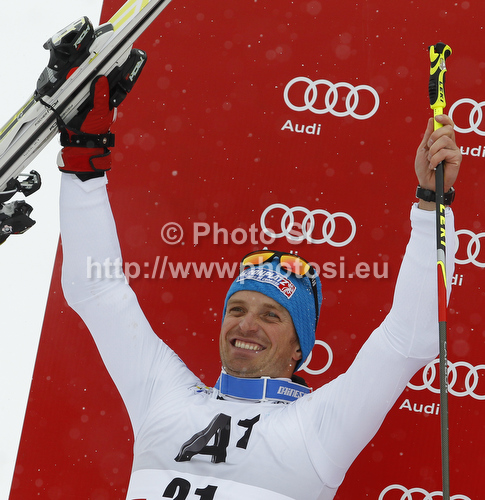 : Second placed Manfred Moelgg of Italy celebrates his medal won in men giant slalom race of Audi FIS Alpine skiing World cup 2012-2013 in Soelden, Austria. First men giant slalom race of Audi FIS Alpine skiing World cup was held on Rettenbach glacier above Soelden, Austria, on Sunday, 28th of October 2012.