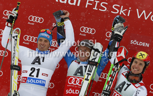 : Winner Ted Ligety of USA (M), second placed Manfred Moelgg of Italy (L) and third placed Marcel Hirscher of Austria (R) celebrate their medals won in men giant slalom race of Audi FIS Alpine skiing World cup 2012-2013 in Soelden, Austria. First men giant slalom race of Audi FIS Alpine skiing World cup was held on Rettenbach glacier above Soelden, Austria, on Sunday, 28th of October 2012.