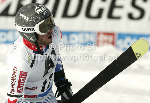 : Thomas Fanara of France reacts in finish of first run of men giant slalom race of Audi FIS Alpine skiing World cup 2012-2013 in Soelden, Austria. First men giant slalom race of Audi FIS Alpine skiing World cup was held on Rettenbach glacier above Soelden, Austria, on Sunday, 28th of October 2012.