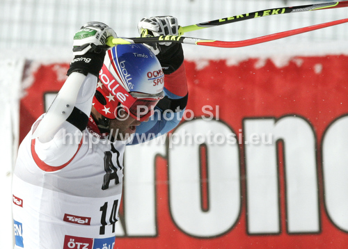 : Didier Defago of Switzerland reacts in finish of first run of men giant slalom race of Audi FIS Alpine skiing World cup 2012-2013 in Soelden, Austria. First men giant slalom race of Audi FIS Alpine skiing World cup was held on Rettenbach glacier above Soelden, Austria, on Sunday, 28th of October 2012.