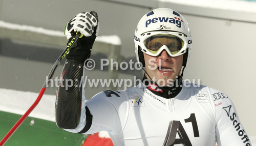 : Romed Baumann of Austria reacts in finish of first run of men giant slalom race of Audi FIS Alpine skiing World cup 2012-2013 in Soelden, Austria. First men giant slalom race of Audi FIS Alpine skiing World cup was held on Rettenbach glacier above Soelden, Austria, on Sunday, 28th of October 2012.