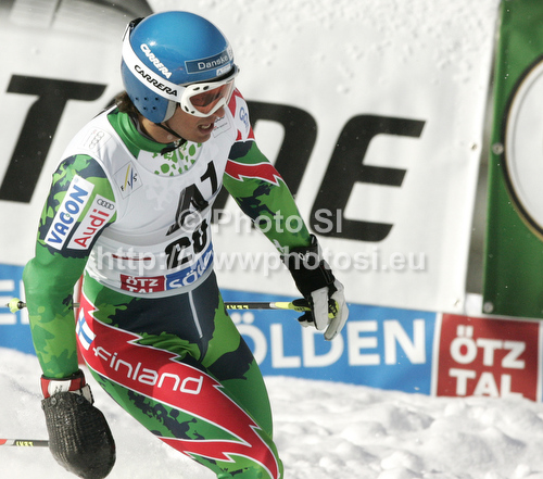 : Marcus Sandell of Finland reacts in finish of first run of men giant slalom race of Audi FIS Alpine skiing World cup 2012-2013 in Soelden, Austria. First men giant slalom race of Audi FIS Alpine skiing World cup was held on Rettenbach glacier above Soelden, Austria, on Sunday, 28th of October 2012.
