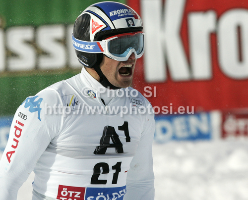 : Manfred Moelgg of Italy reacts in finish of first run of men giant slalom race of Audi FIS Alpine skiing World cup 2012-2013 in Soelden, Austria. First men giant slalom race of Audi FIS Alpine skiing World cup was held on Rettenbach glacier above Soelden, Austria, on Sunday, 28th of October 2012.