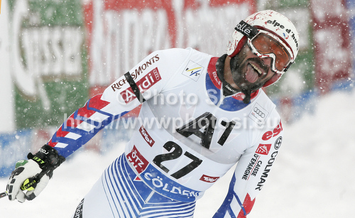 : Gauthier De Tessieres of France reacts in finish of second run of men giant slalom race of Audi FIS Alpine skiing World cup 2012-2013 in Soelden, Austria. First men giant slalom race of Audi FIS Alpine skiing World cup was held on Rettenbach glacier above Soelden, Austria, on Sunday, 28th of October 2012.
