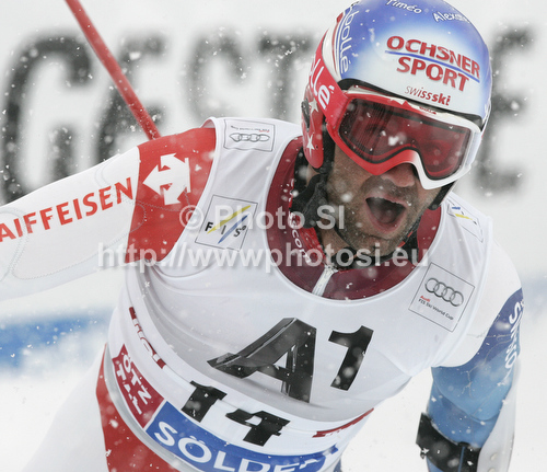 : Fifth placed Didier Defago of Switzerland reacts in finish of second run of men giant slalom race of Audi FIS Alpine skiing World cup 2012-2013 in Soelden, Austria. First men giant slalom race of Audi FIS Alpine skiing World cup was held on Rettenbach glacier above Soelden, Austria, on Sunday, 28th of October 2012.