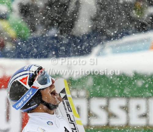 : Second placed Manfred Moelgg of Italy reacts in finish of second run of men giant slalom race of Audi FIS Alpine skiing World cup 2012-2013 in Soelden, Austria. First men giant slalom race of Audi FIS Alpine skiing World cup was held on Rettenbach glacier above Soelden, Austria, on Sunday, 28th of October 2012.