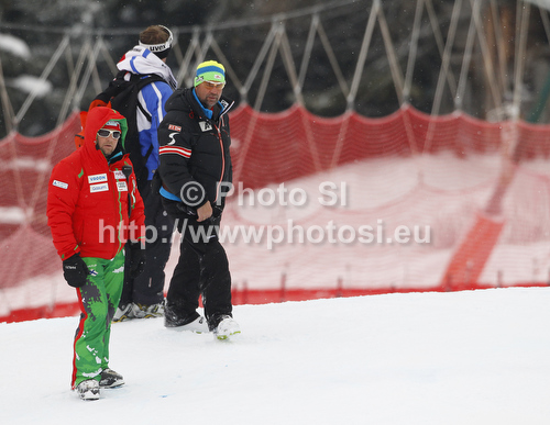 : Finnish coach Sergej Poljsak (L) observing athletes skiing in men super-g race of Audi FIS Alpine skiing World cup 2012-2013 in Val Gardena, Italy. Man super-g race of Audi FIS Alpine skiing World cup was held on Saslong course in Val Gardena, Italy, on Friday, 14th of December 2012.