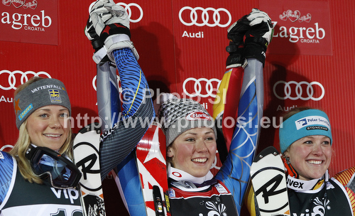 : Winner Mikaela Shiffrin of USA (M), second placed Frida Hansdotter of Sweden (L) and third placed Erin Mielzynski of Canada (R) celebrate their medals won in women night slalom Snow Queen Trophy race of Audi FIS Alpine skiing World cup 2012-2013 on Sljeme above Zagreb, Croatia. Women night slalom Snow Queen Trophy race of Audi FIS Alpine skiing World cup was held on Sljeme above Zagreb, Croatia, on Friday, 4th of January 2013.