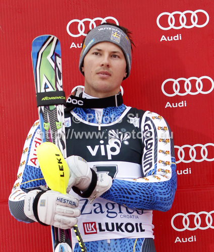 : Second placed Andre Myhrer of Sweden celebrates his medal won in men slalom Snow Queen Trophy race of Audi FIS Alpine skiing World cup 2012-2013 on Sljeme above Zagreb, Croatia. Men slalom Snow Queen Trophy race of Audi FIS Alpine skiing World cup was held on Sljeme above Zagreb, Croatia, on Sunday, 6th of January 2013.