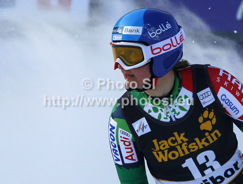 : Tanja Poutiainen of Finland reacts in finish of second run of women giant slalom Golden Fox trophy race of Audi FIS Alpine skiing World cup 2012-2013 in Maribor, Slovenia. Women giant slalom race of Audi FIS Alpine skiing World cup was held in Maribor, Slovenia, on Saturday, 26th of January 2013.